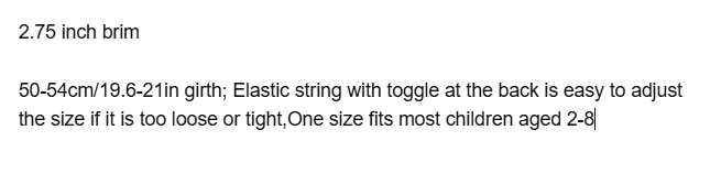 • 50-54cm/19.6-21in girth; Elastic string with toggle at the back is easy to adjust the size if it is too loose or tight,One size fits most children aged 2-8